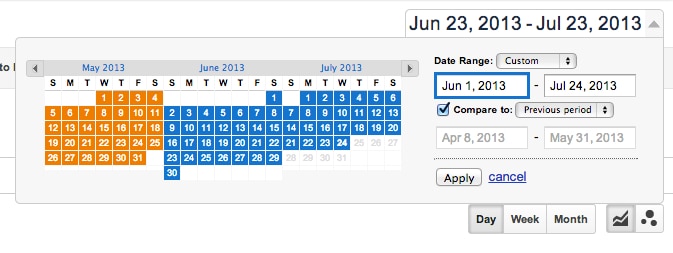 Step 4: For the purposes of this tutorial, we're trying to find sources of change over time, so we need to set our date range. You find the date range at the top right of your screen. You need to set the current range, and then check the “Compare to” box to pick a previous period. So if you're looking for summer traffic versus spring traffic, you can select dates that represent those time periods. Click “Apply” and your data will update below.