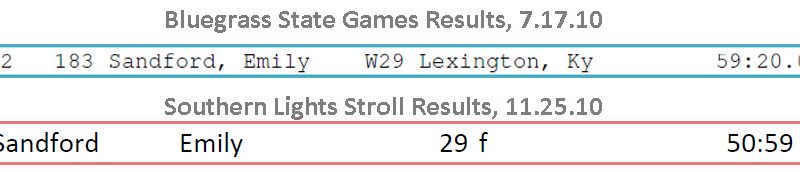 I just realized that the Southern Lights Stroll 5K results were up. I knew I finished somewhere around the 50…