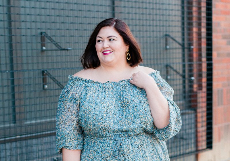 I can’t get enough of Anthropologie plus sizes. The styles are beautiful and fit well. Here’s my latest purchase: an off-the-shoulder dress with a delicate floral pattern and silver metallic thread.